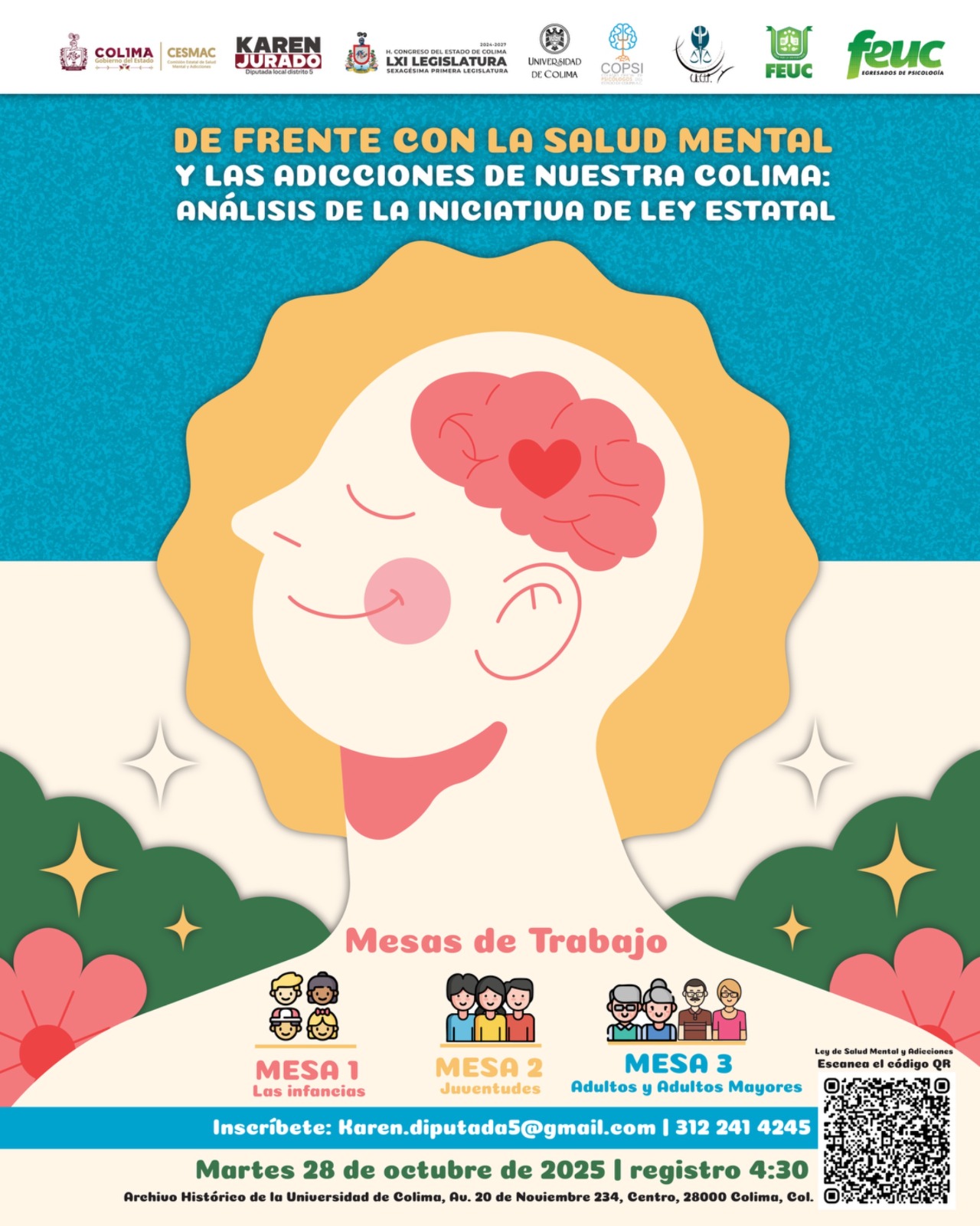 La diputada Karen Jurado Escamilla, presidenta de la Comisión Legislativa de Salud y Deporte, informó que ya se encuentran abiertas las inscripciones para participar en las mesas de trabajo a desarrollarse en el foro: “De frente con la salud mental y las adicciones en nuestra Colima; análisis de la iniciativa de Ley Estatal”, el cual se llevará a cabo el próximo martes 28 de octubre a partir de las 4:30 de la tarde, en el archivo histórico de la Universidad de Colima.